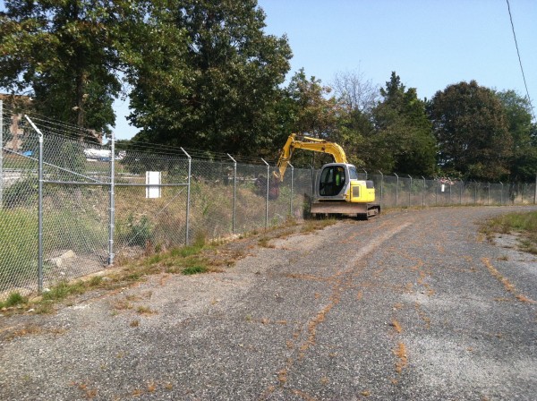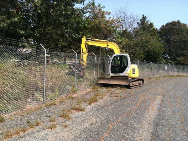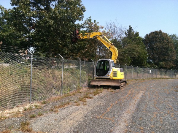 The New Holland E70 equipped with a Fecon Mulching head grinds trees and branches off of and away from an existing fence. The finished product allows enhanced visibility of the area and longevity of the fence and surrounding structures.